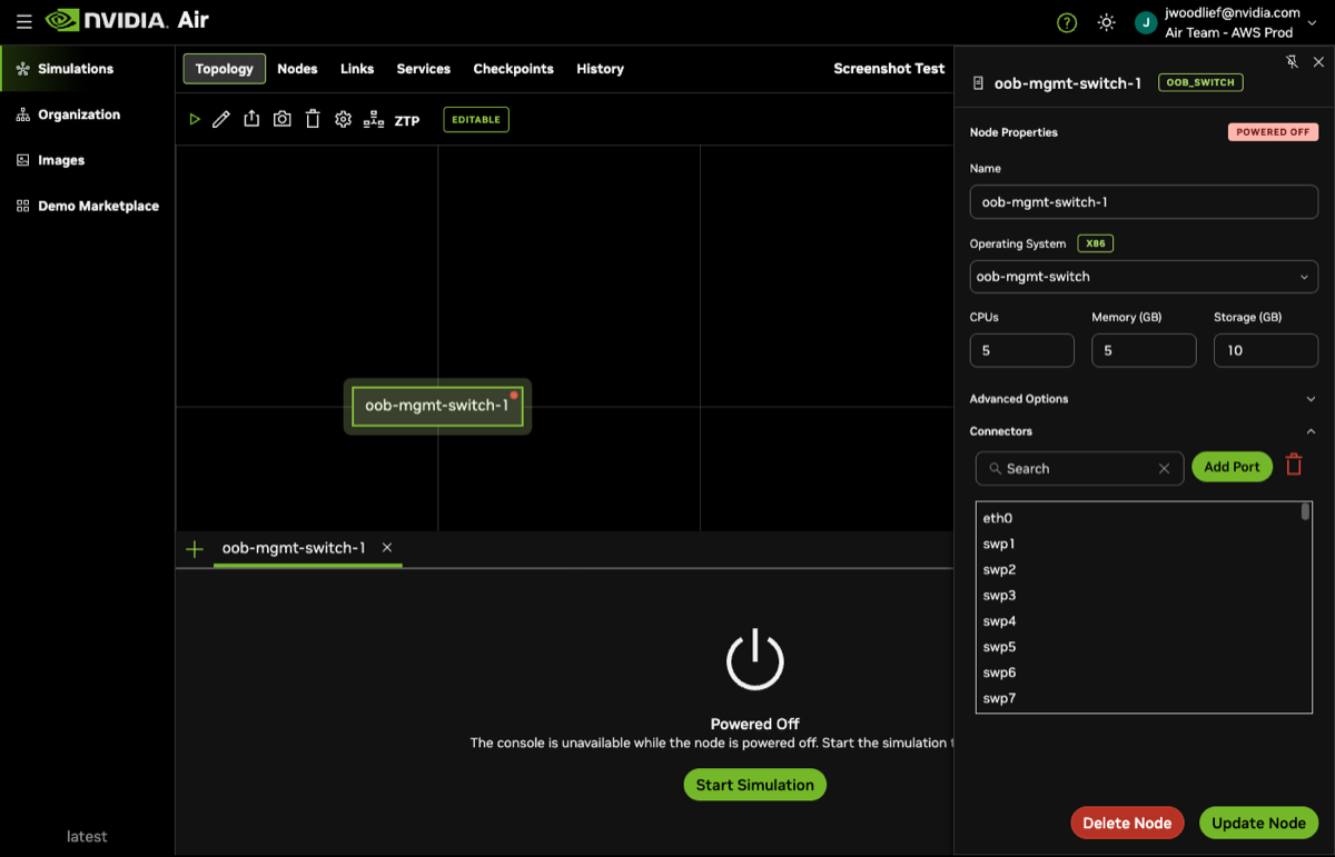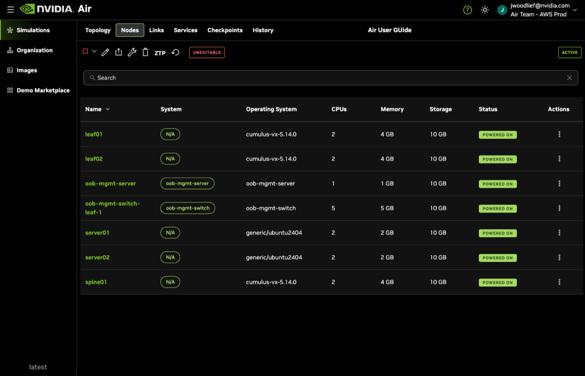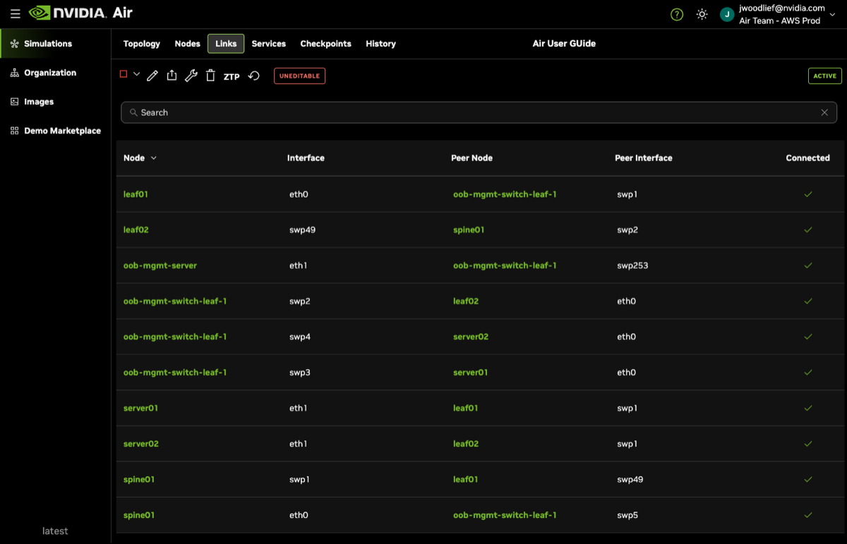 When you view the links within Air after starting the simulation, notice that the nodes are connected based on the file, and also connected to the out-of-band management network: