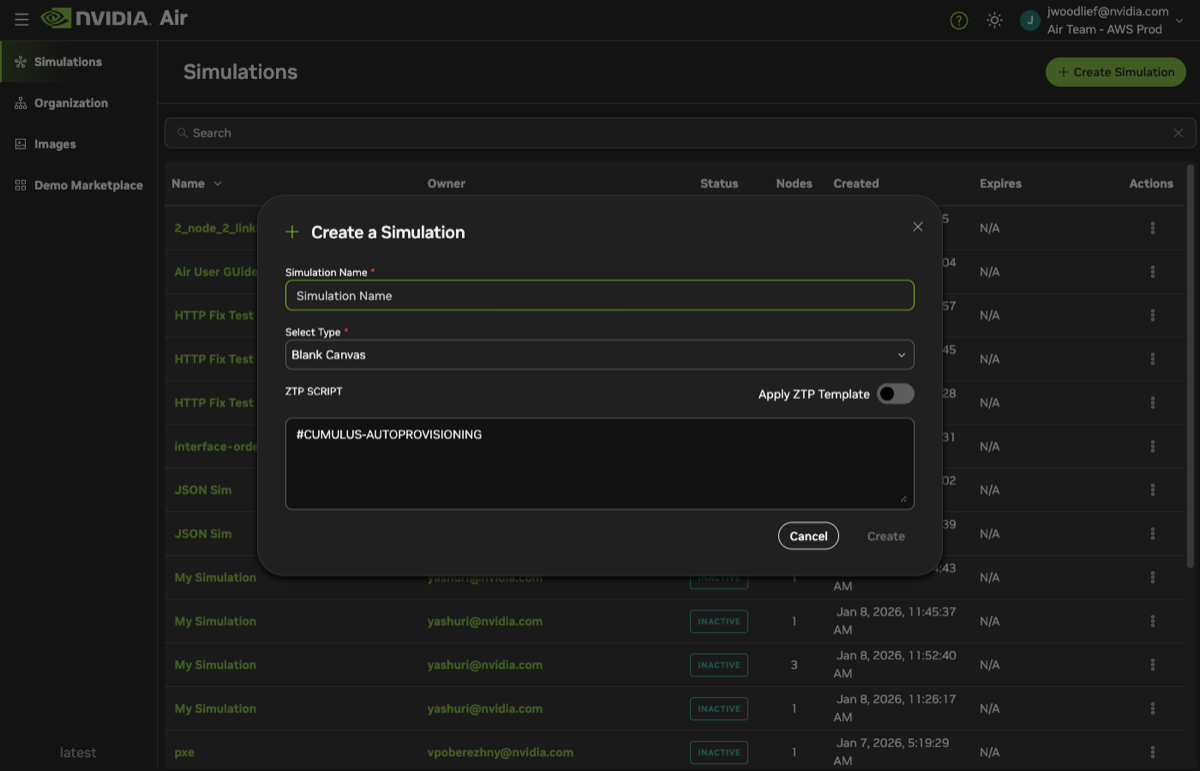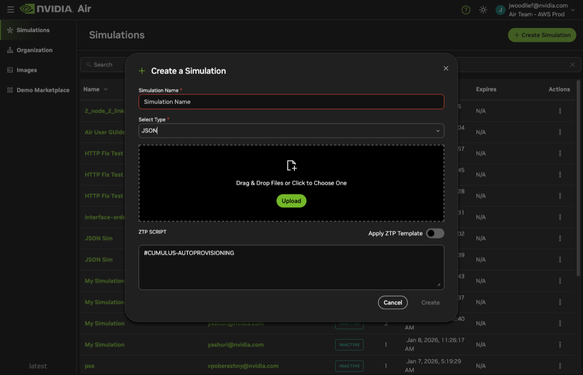 When you create a new simulation, Air gives you the option to add a zero-touch provisioning (ZTP) script. The ZTP script is copied to the simulation’s oob-mgmt-server. Any node making a ZTP request on the out-of-band management network has access to this ZTP script through a DHCP server and web server running on the oob-mgmt-server.